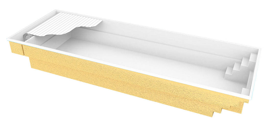 En av de større modellene. 11,10 x 3,75 m x 1,50 m. På grunn av lengden er bassenget perfekt for profesjonell svømming og konkurranser. Trappene i denne modellen er designet for å ta opp så lite plass som mulig. I tillegg, bassenget et kammer for et bassengtrekk. Bassengtrekket er den perfekte beskyttelsen for barn og kjæledyr.