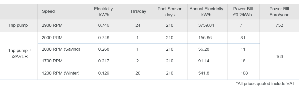 Nedenfor er en grov beregning av hvor mye du kan spare per år med en iSAVER + Inverter for bassengpumpe installert.