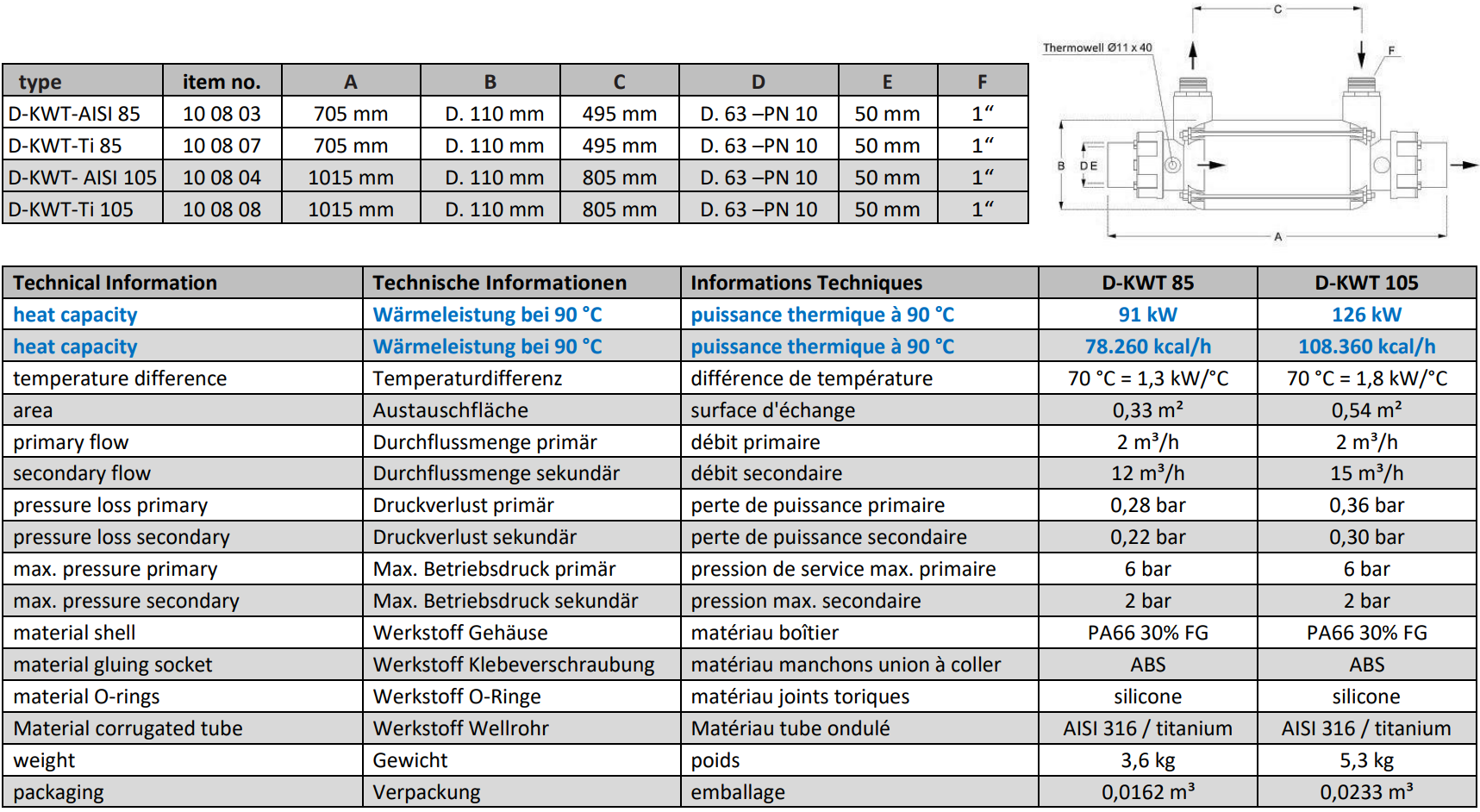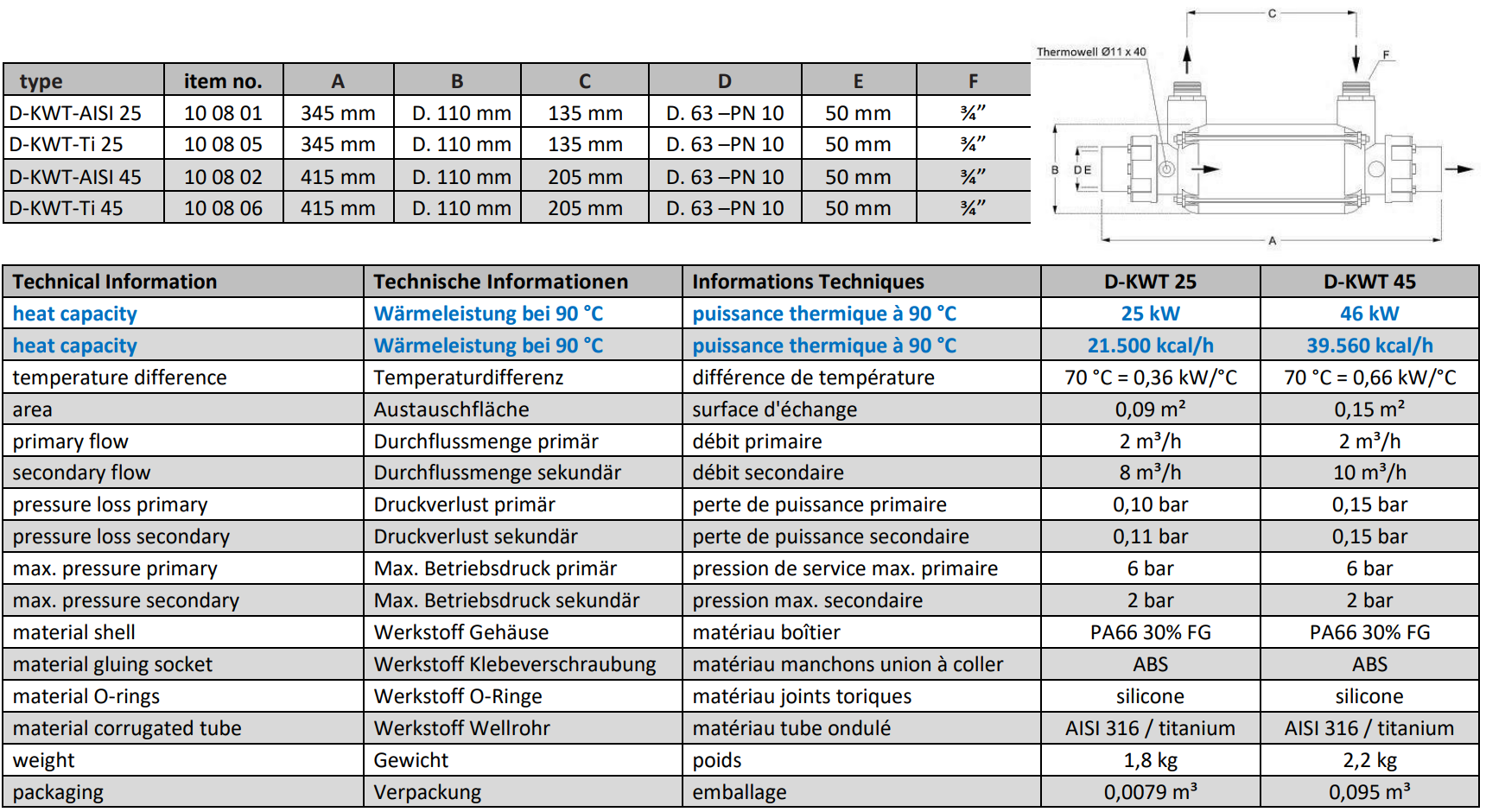 Vann/vann-varmeveksler med korrugerte kryssrør – i motsetning til glatte rør tilbyr de korrugerte rørene i rustfritt stål eller titan høy energieffektivitet til lave materialkostnader. Plastskallet tåler høyt trykk og er korrosjonsbestandig. De enkelte komponentene er forseglet med silikonpakninger og sikrer lang levetid for hele varmeveksleren. Kostnadseffektiviteten og kvaliteten gjør titanutgaven spesielt attraktiv. Som alle rørvarmevekslere må de integreres i badevannskretsen enten direkte eller via bypass-systemet.