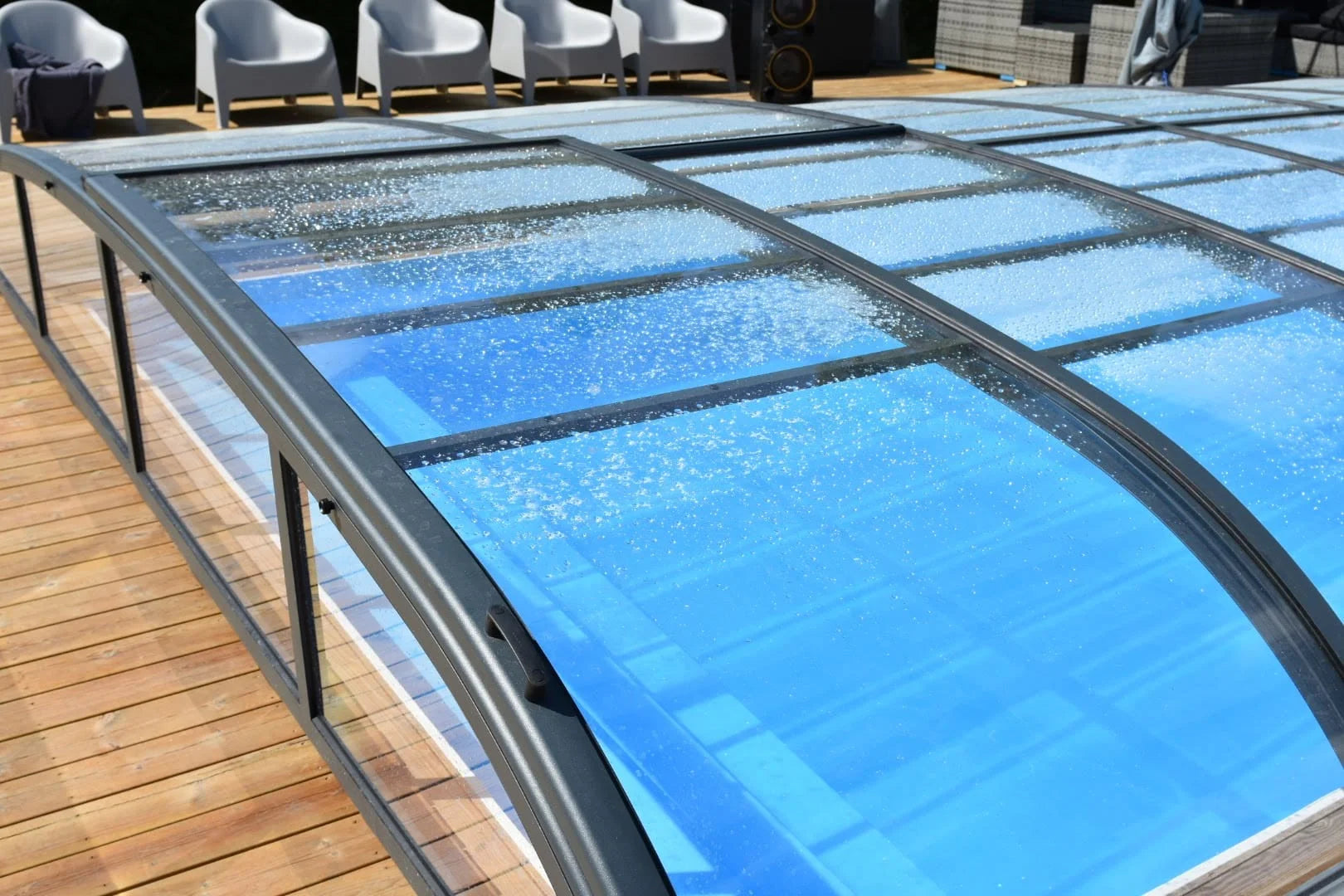 Bassengtaket har sterke aluminiumsprofiler som holder barn og dyr unna bassengområdet. Bassengtaket er en lav modell som er utstyrt med uknuselig solid polykarbonat (klar plast) og antrasitt/eloksert aluminiumsprofiler.