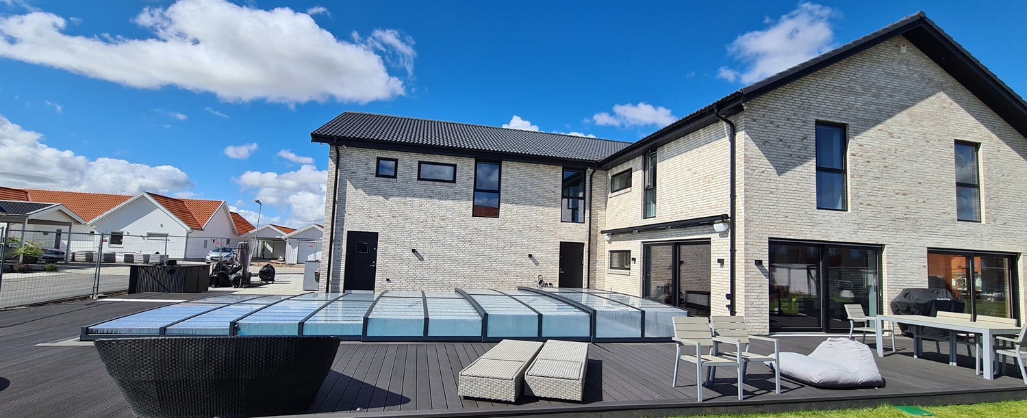 En lav bassengtak med klart polykarbonatglass og antrasitt pulverlakkerte aluminiumsprofiler.